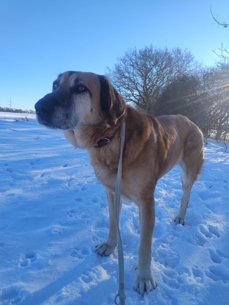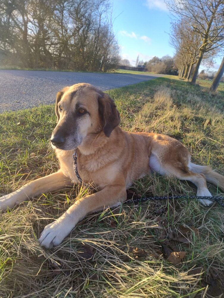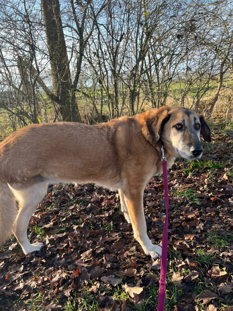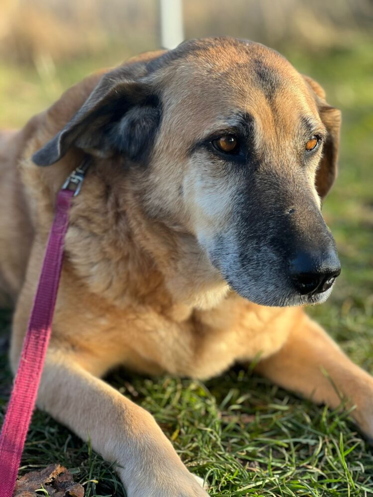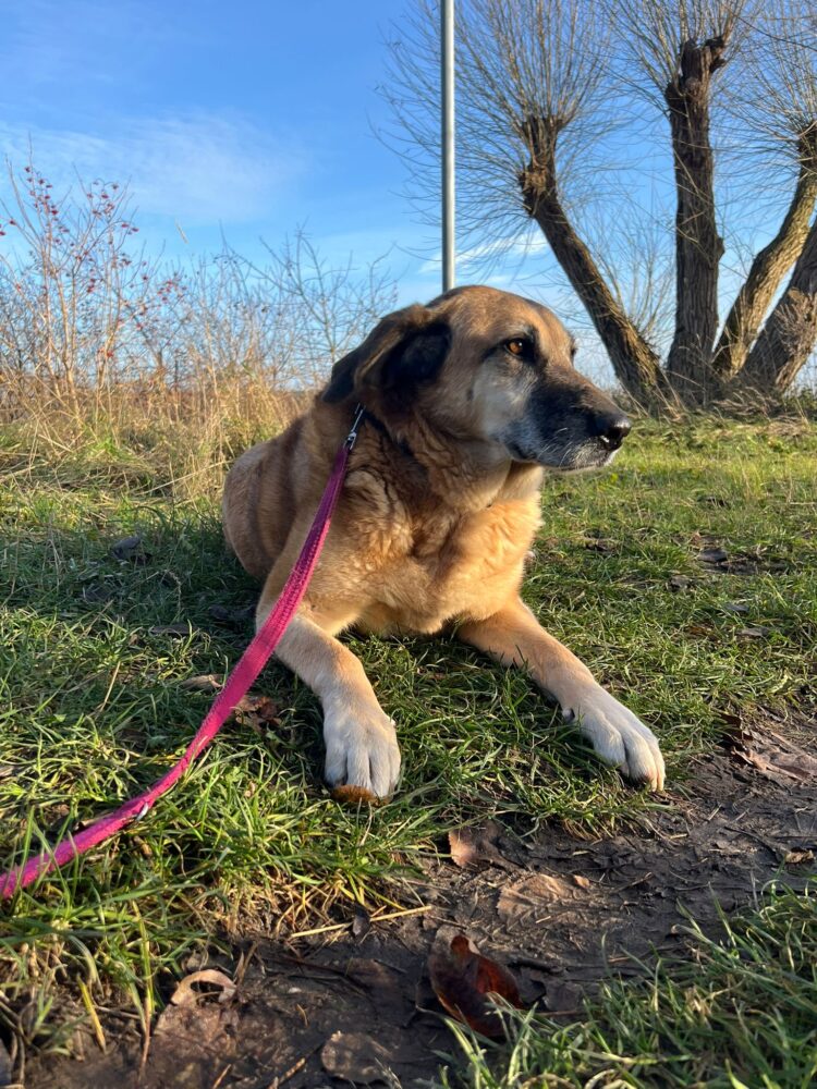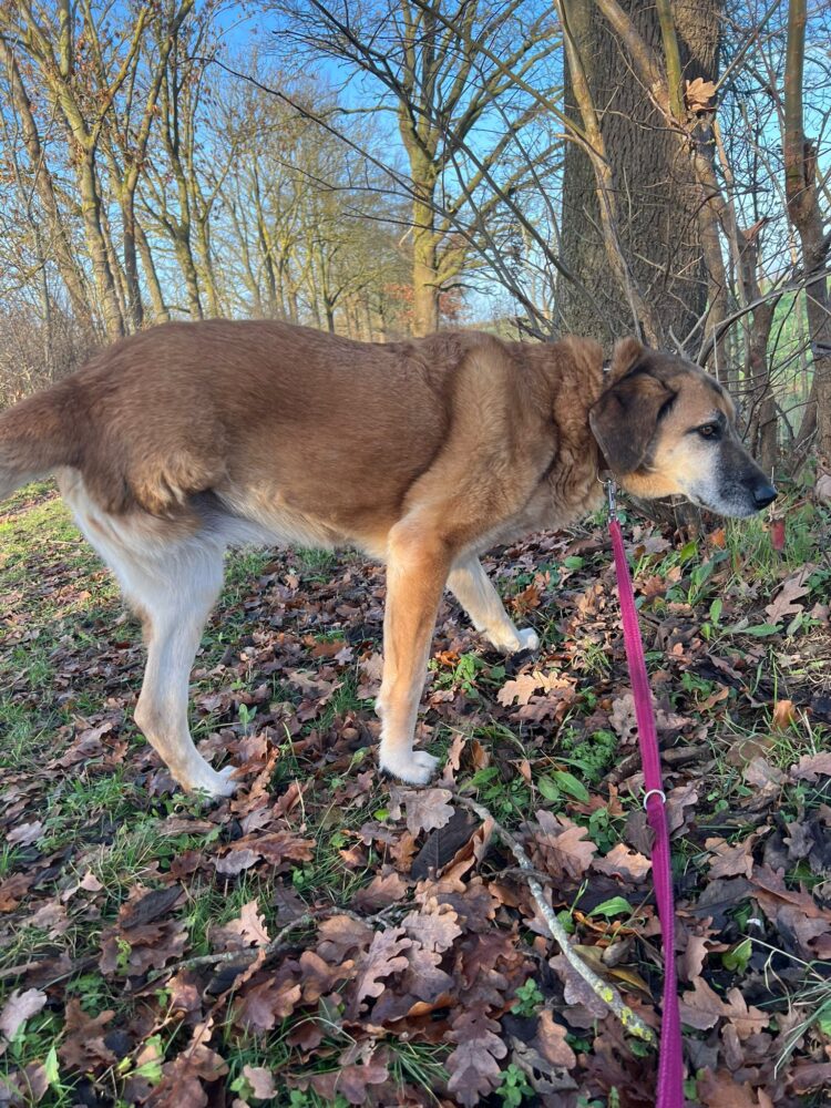 Bei und wird Baroneasa nur Nessa genannt und hört darauf auch super. Sie ist eine Schäfermix Dame und läuft auf 3 Beinen durch die Welt. Wer nun denkt, dass sie dadurch eingeschränkt ist, irrt sich gewaltig. Nessa ist ein flotter Feger und hat ordentlich Tempo drauf, wenn es zum Spaziergang losgeht. Sie ist eine offene und wachsame Hündin und liebt ihren Menschen bedingungslos. Nessa ist über die Zeit uns sehr viel offener geworden und traut sich viel besser an neue Menschen heran. Mit ihren Artgenossen kommt sie gut zurecht, kann manchmal etwas eifersüchtig sein, ist aber wunderbar zu händeln und hört gut. Was Nessa besonders schätzt ist Körpernähe. Sie liebt es gekrault, gebürstet und betuttelt zu werden. Die große, rotblonde ist sehr innig und verschenkt ihr Herz zu 100% wenn sie vertraut und sich gehen lassen kann. Nessa fehlt es manchmal an Impulskontrolle und wie eine kleine Dampflok wirbelt sie dann umher. Darum denken wird, dass allzu kleine Kinder nicht in ihrem neuen Zuhause leben sollten. Sie ist liebevoll und macht artig mit, wenn man sie auffordert ganz in Ruhe zu machen. Nessa braucht aufgrund ihres Handicaps ein ebenerdiges und großzügiges Zuhause. Auch wenn sie viel Energie mitbringt, weiß sie Gemütlichkeit sehr zu schätzen und Pausen und Zeiten zum abschalten sind für Nessa ganz besonders wichtig. Wer sich für unsere Nessa entscheidet, bekommt nicht nur eine herzensgute, loyale und friedliebende Hündin, er bekommt auch ihr riesiges Herz geschenkt. Wir finden sie ist eine ganz tolle Ergänzung zur bestehenden Fellfamilie oder auch eine wundervolle Einzelprinzessin. Wer möchte Nessa ihren großen Traum vom eigenen Bettchen und einer eigenen Familie erfüllen?