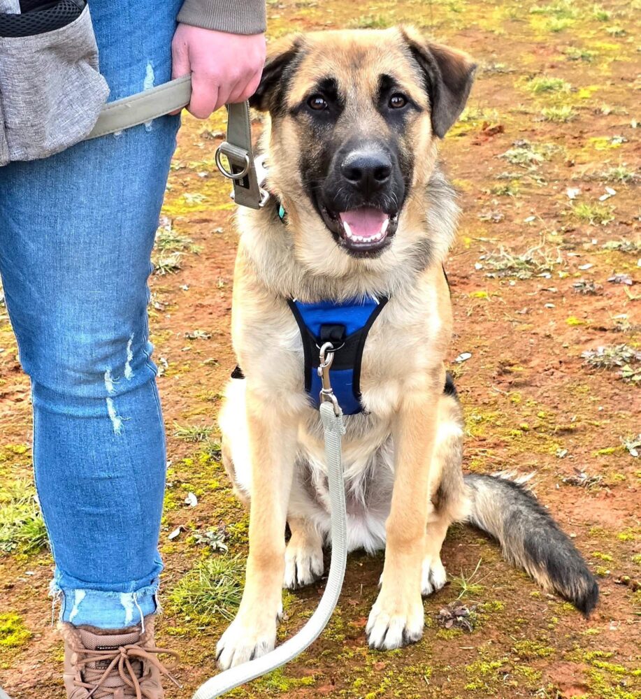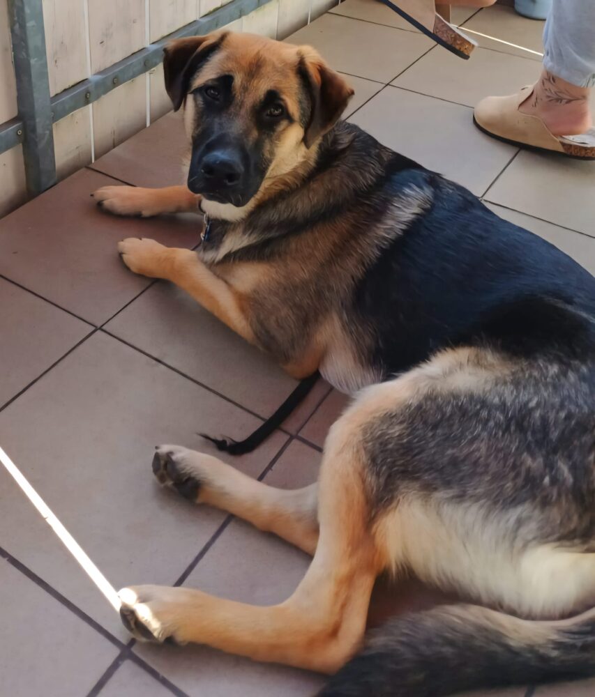 Rico ist ein großer, athletischer Schäfermix mit hellem Fell, dunkler Maske.